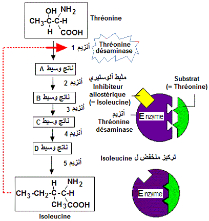 Les enzymes allostériques (إنزيمات الموقع الآخر - إنزيمات ألوستيرية, Allosteric enzymes) assurent la régulation des chaînes métaboliques. Cette faculté est due à la présence d'un site régulateur (en plus du site actif) qui réagit avec des modulateurs qui viennent d'ailleurs (allosterie, Allostery). Les enzymes allostériques sont des enzymes assurant la régulation des chaînes métaboliques.