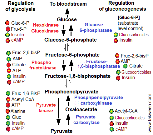 La n éoglucogenèse et la glycolyse se déroulent, toutes, dans le cytosol. Des conflits peuvent apparaître au niveau de l'utilisation des intermédiaires communs entre la glycolyse et la néoglucogenèse. Les deux processus ne répondent pas aux mêmes objectifs, la glycolyse produit de l'énergie, alors que la néoglucogenèse la conserve. La régulation réciproque des 2 processus s'impose de manière à les ajuster en fonction de l'état énergétique et des besoins cellulaires ou des tissus. En effet, lorsque l'une est inhibée l'autre est active et vice versa (comparer les régulations de la glycolyse et de la néoglucogenèse). Le principal signal qui règle cette régulation est le rapport ATP/AMP.